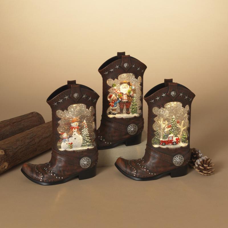 Lighted Spinning Water Globe Boot W. Holiday Design 10.25"