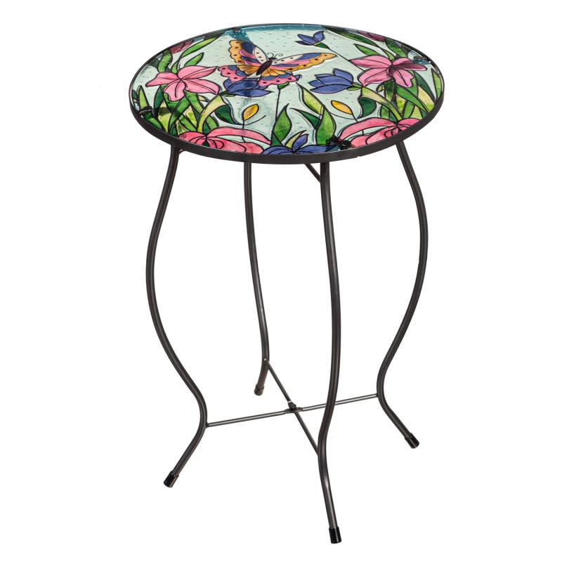 Glass Outdoor Side Table, Butterfly & Flowers